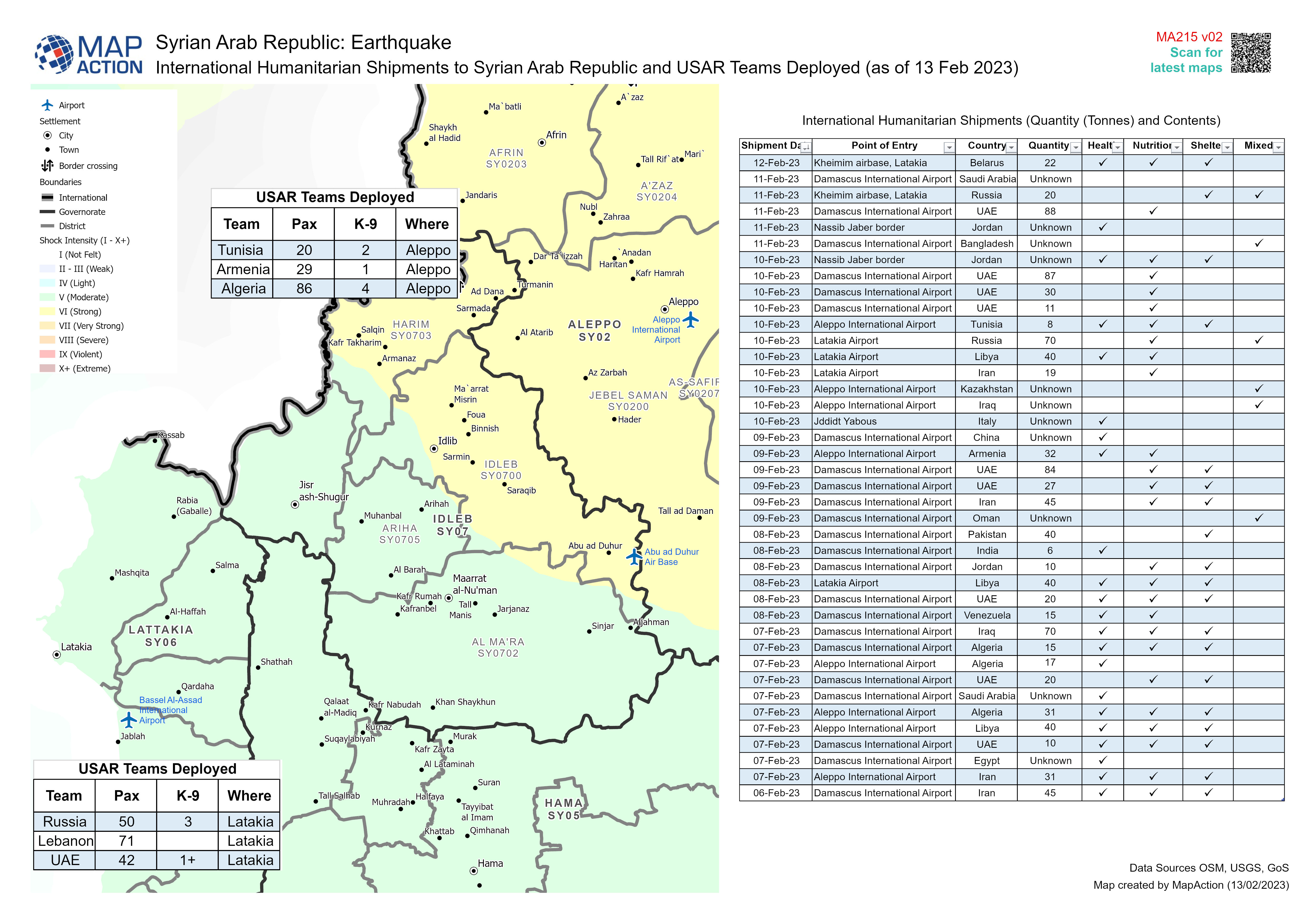 USAR Teams and EMT teams deploying to Syria are invited to provide updates on the Virtual OSOCC (via comments below) and/or contact the INSARAG Secretariat (insarag@un.org)Please note that as 20th February, it was communicated that Search and Rescue teams are not longer required in Lattakia, Tartous, Homs, Hama and Aleppo.